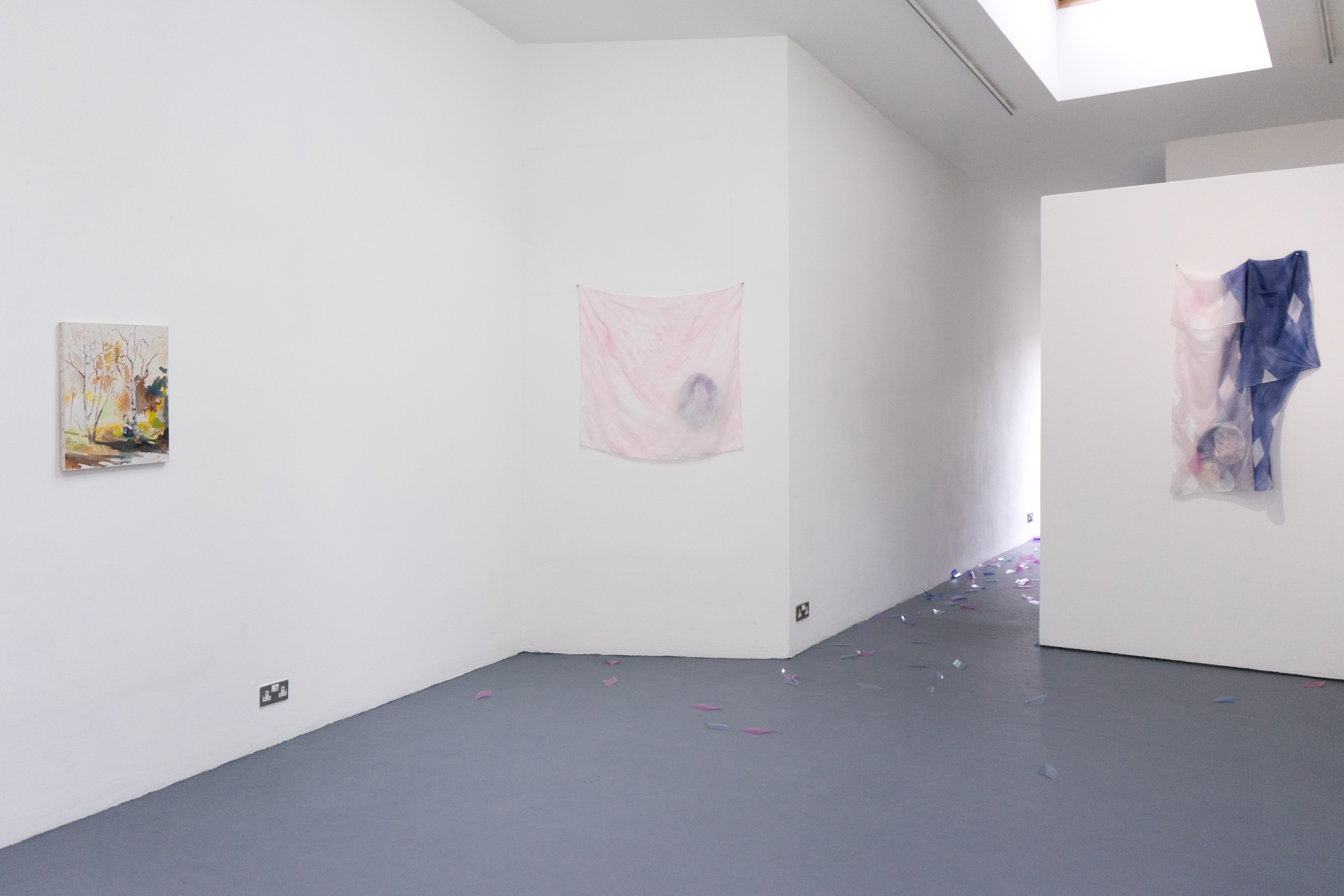 For the exhibition at Kingsgate Project Space the figure is all but gone. But the touch; the kiss of light on fabric; the sense of an ending or a recently absented presence lingers. In painted silk drapes, cut lighting gels and porcelain confetti, the close friend, the loved one, haunts the remnants from some extraordinary event – itself already transformed by memories.